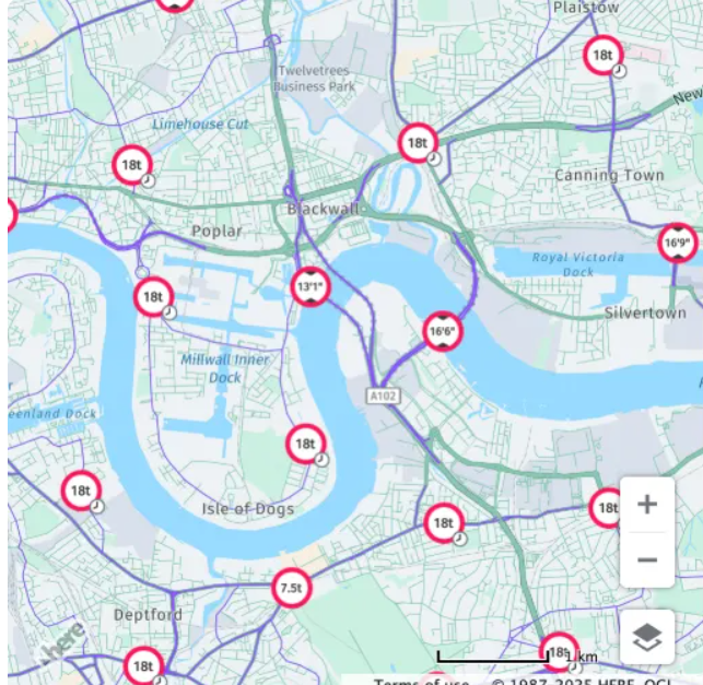 Os novos recursos complementam funcionalidades já existentes para casos de uso em Transporte e Logística, como restrições gerais de veículos, perfis de veículos, Logistics Map Style e renderização de zonas de congestionamento ou ambientais.