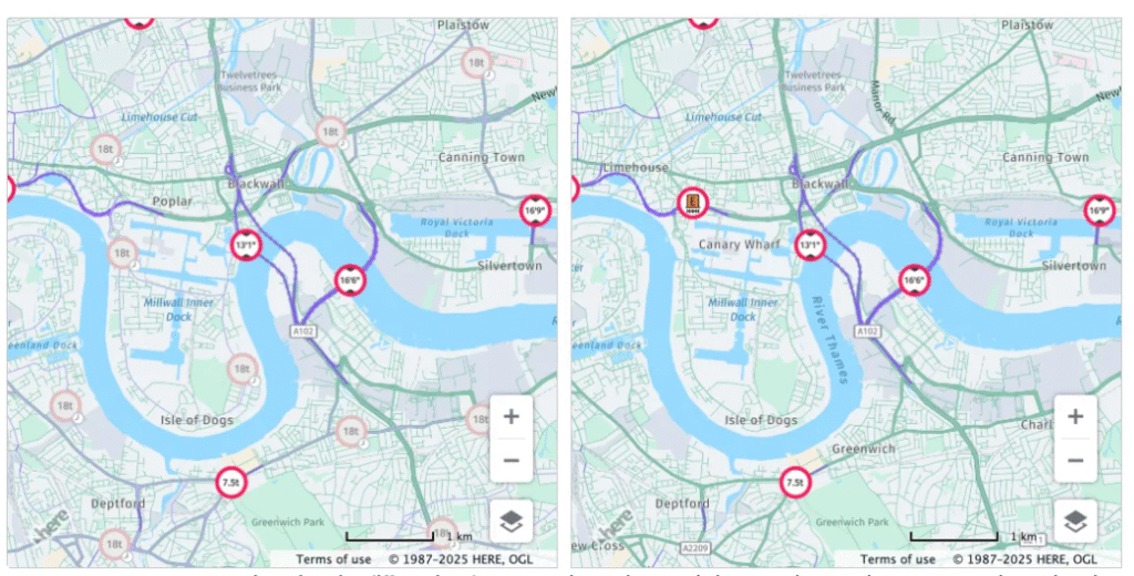 Imagem da esquerda: Modo “ativo e inativo diferenciados”: todas as restrições de veículos ativas são exibidas em cores completas, enquanto as inativas aparecem em cores esmaecidas. Imagem da direita: Modo “apenas ativos”: todas as restrições de veículos ativas são exibidas, enquanto as inativas ficam ocultas.